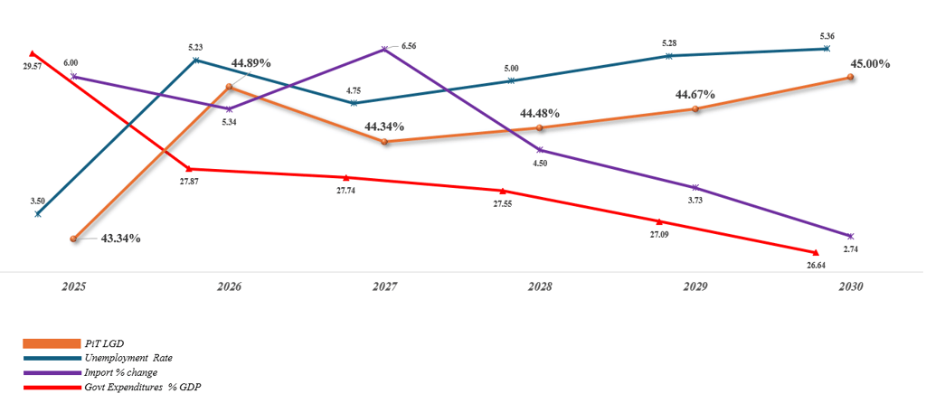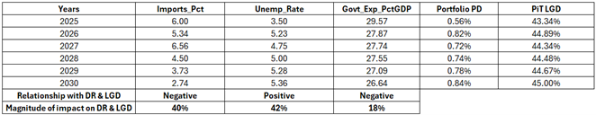 Given that the portfolio under consideration is a consumer portfolio, LGD sensitivity is most pronounced with respect to unemployment and import trends. As unemployment rises, borrower repayment capacity weakens, leading to higher default rates and lower recoveries. At the same time, declining import activity signals broader economic slowdown, further amplifying credit stress. Together, these dynamics result in an increase in portfolio default rates and a corresponding upward adjustment in PIT LGD over time.