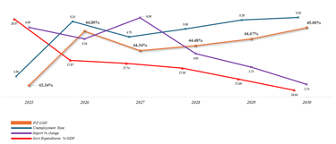 Imports and government expenditure exhibit a negative relationship, where declining economic activity and fiscal support are associated with worsening credit outcomes.