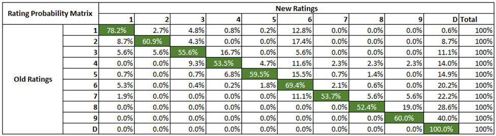 1) The first key insight is that the rating model is performing effectively, as indicated by the diagonal dominance in the transition matrix. This means that all diagonal elements of the transition matrix are larger than the corresponding row sum of off-diagonal elements the matrix.
