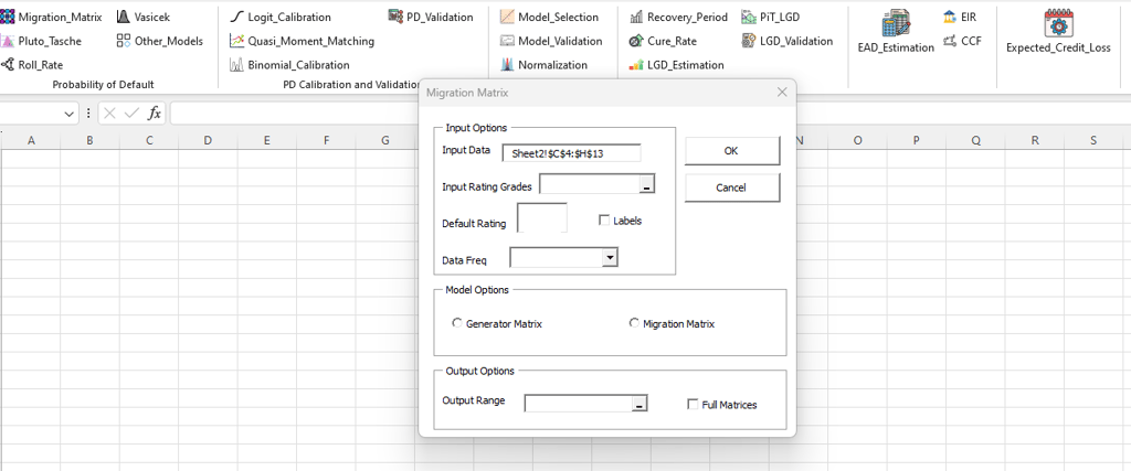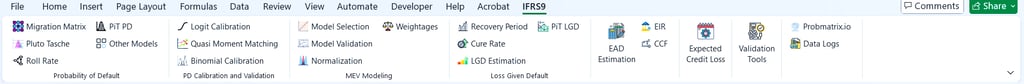 Our Excel Add-in provides an intuitive ribbon interface for comprehensive modeling and data analysis. It includes multiple methodologies for PD, LGD, macroeconomic modeling, and EAD, plus validation tools.